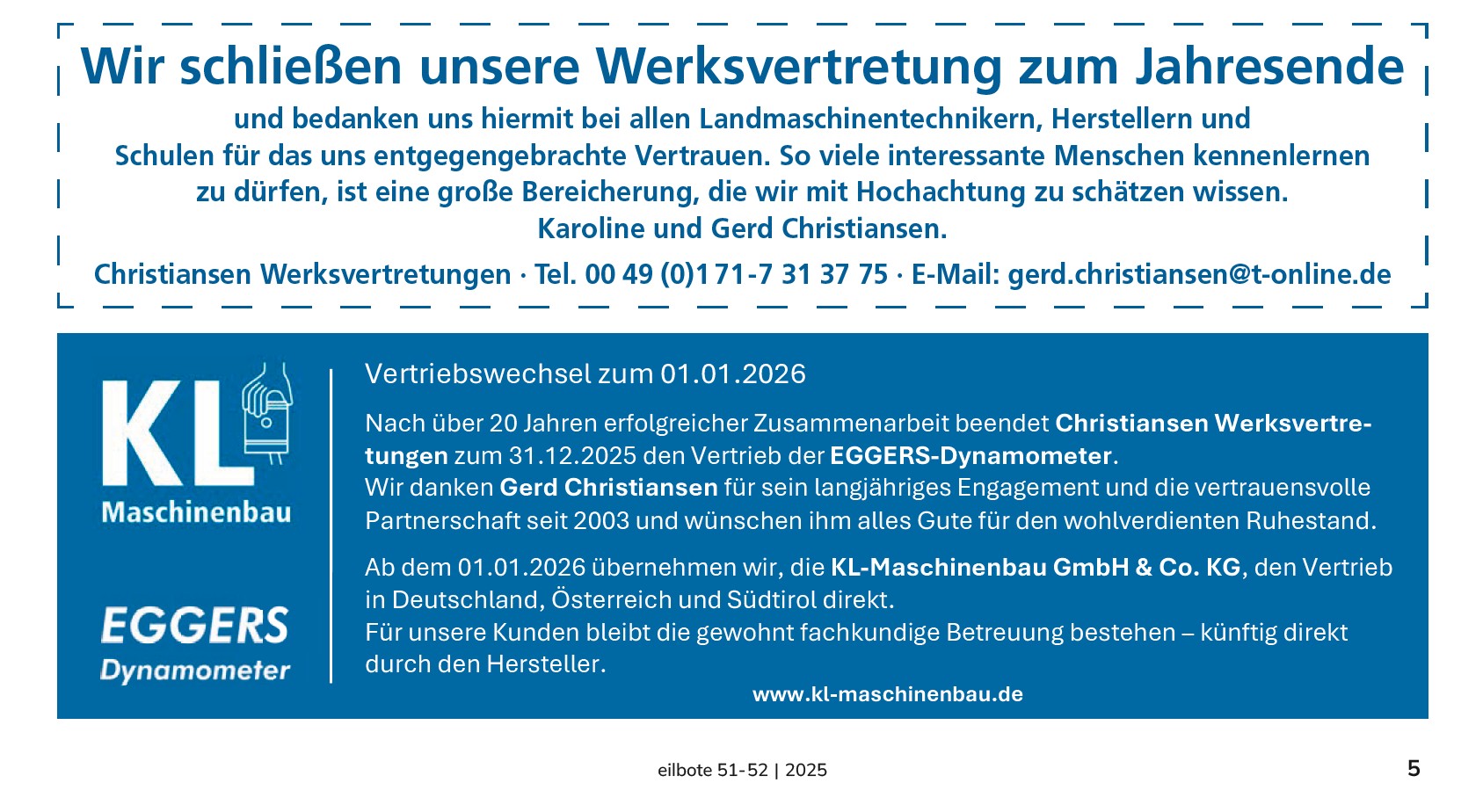 Nach über 20 Jahren erfolgreicher Zusammenarbeit beendet Christiansen Werksvertretungen zum 31.12.2025 den Vertrieb der EGGERS-Dynamometer.